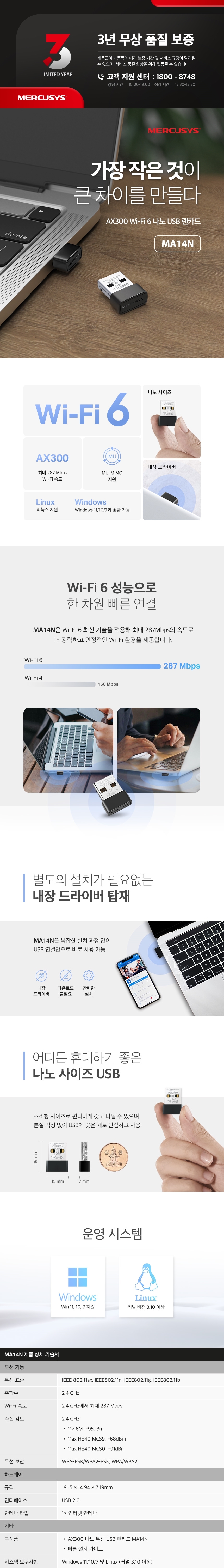 머큐시스 300Mbps MA14N USB 데스크탑 와이파이 무선 랜카드