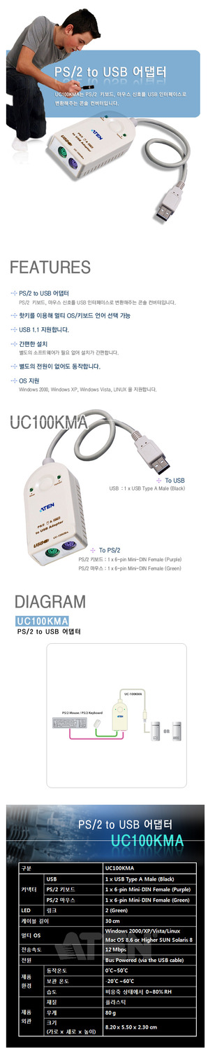 [ATEN] 에이텐 [USB to PS/2 케이블 0.3M] [UC100KMA-AT]