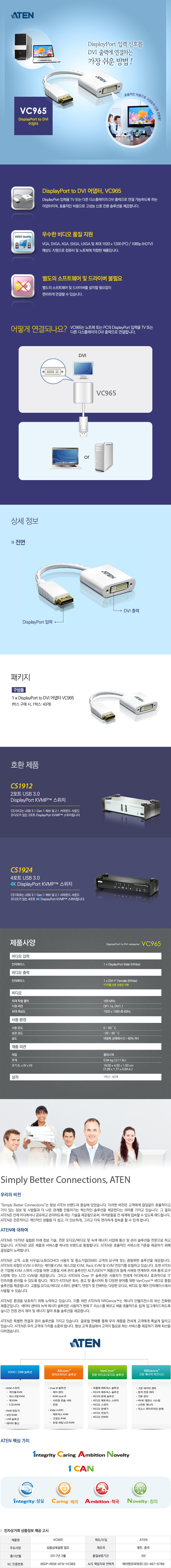 [ATEN] 에이텐 [DisplayPort to DVI 컨버터, 오디오 미지원 [VC965] [화이트] [VC965-AT]